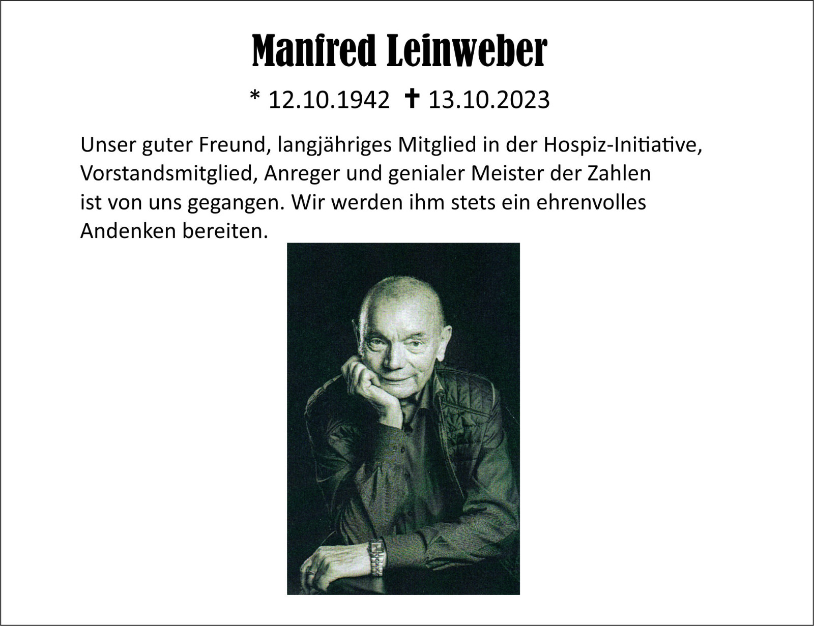 Unser guter Freund, langjähriges Mitglied in der Hospiz-Initative, Vorstandsmitglied, Anreger und genialer Meister der Zahlen ist von uns gegangen. Wir werden ihm stets ein ehrenvolles Andenken bereiten.